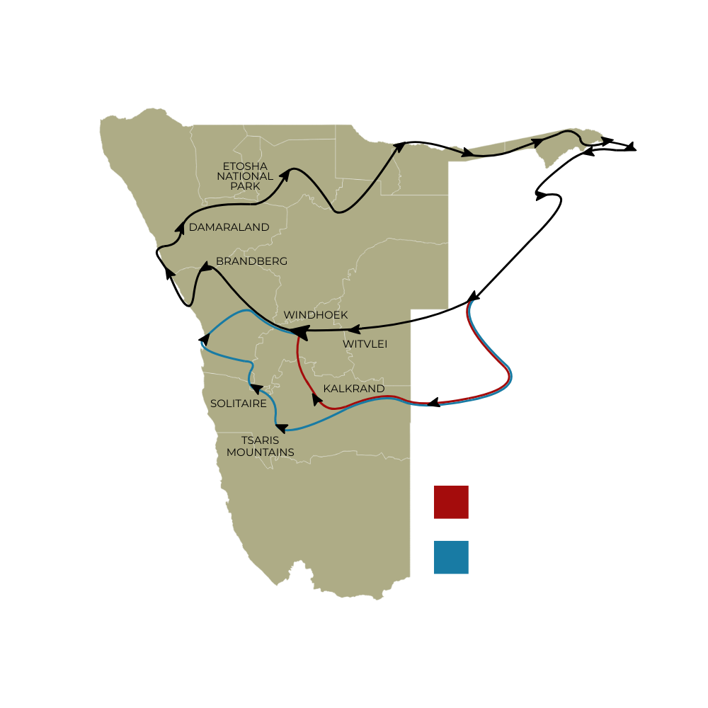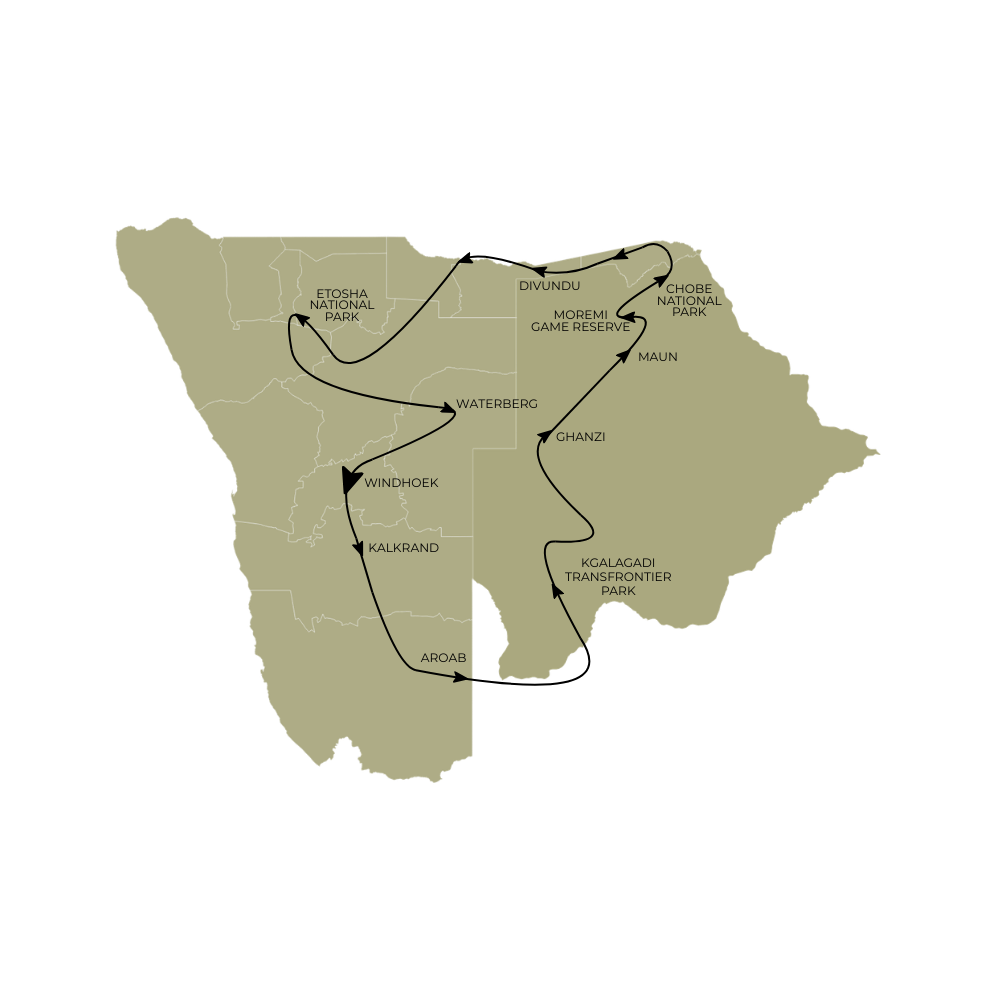 Experience the ultimate Southern African wildlife journey across seven national parks and three countries. Starting and ending in Windhoek, this unforgettable safari travels through Namibia, Botswana and Zimbabwe, showcasing diverse landscapes from the Kalahari and Okavango region to the mighty Victoria Falls and Etosha. Designed for true wildlife enthusiasts, the tour offers exceptional game viewing, breathtaking scenery and remarkable biodiversity for an adventure that captures the very best of Southern Africa.